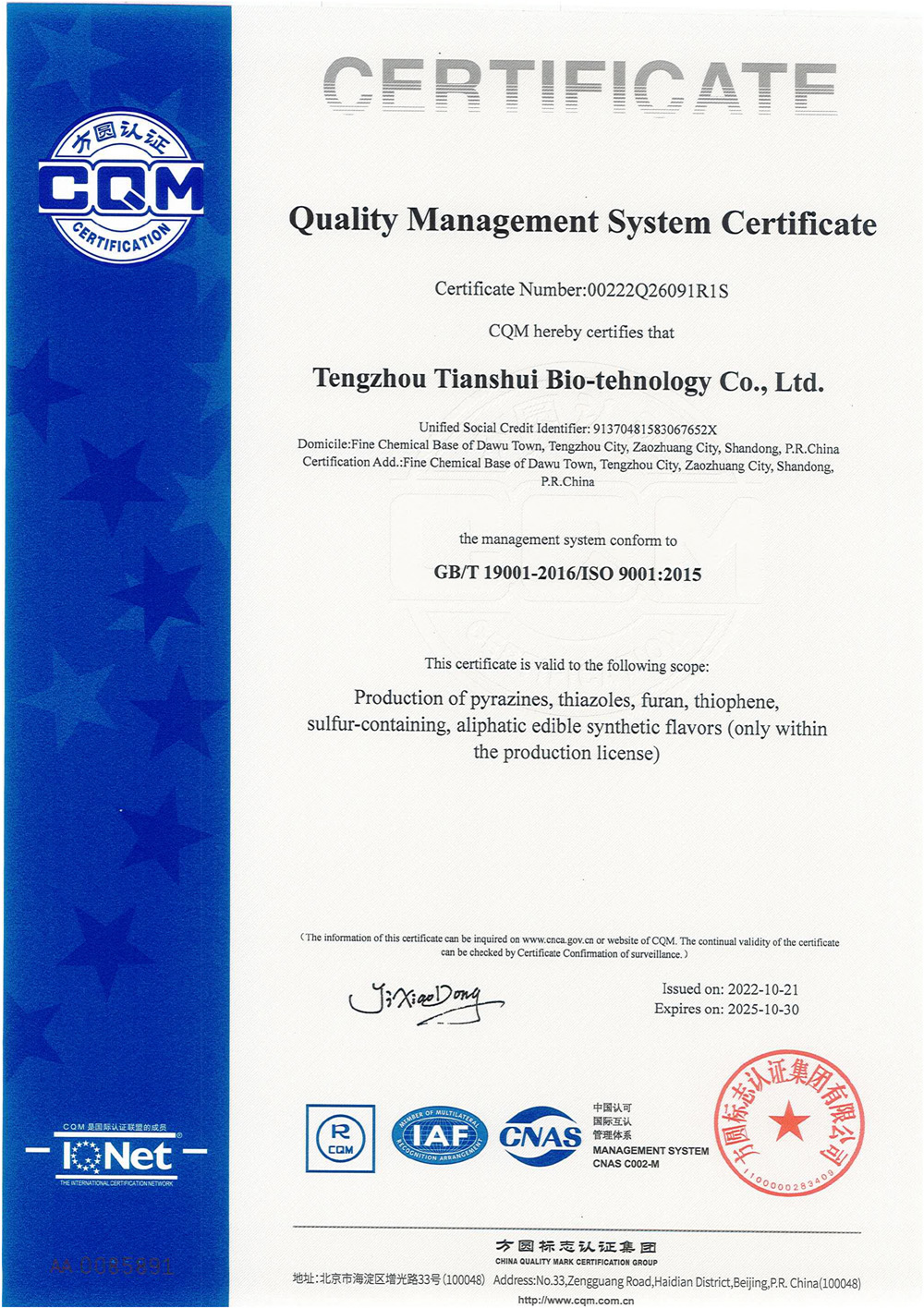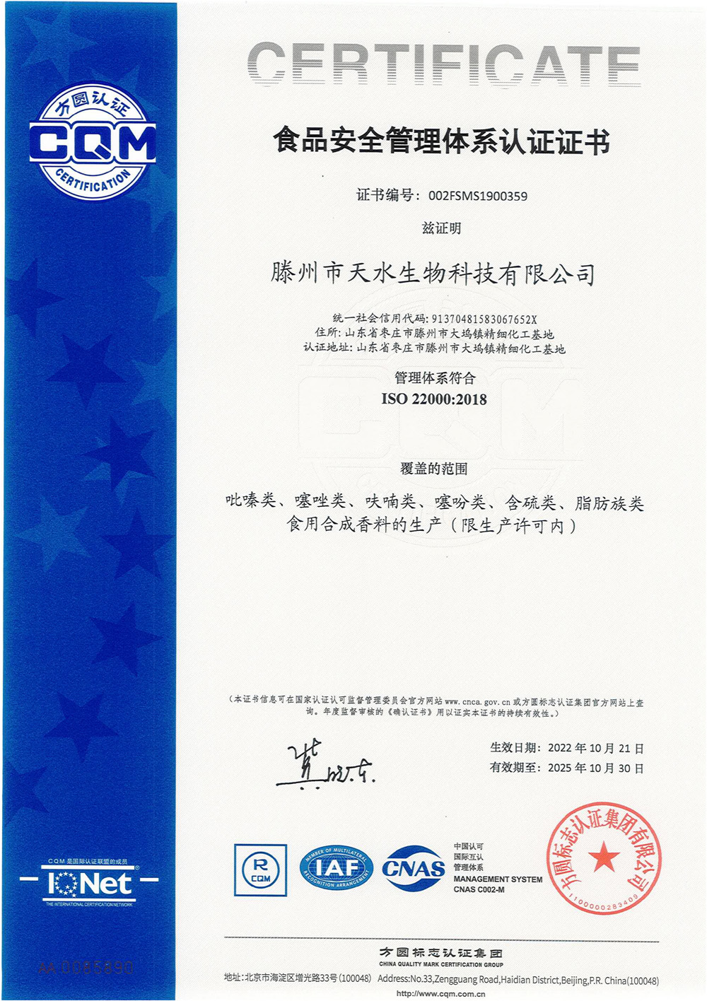 滕州市天水生物科技有限公司成立于2011年9月,是目前國(guó)內(nèi)雜環(huán)類(lèi)合成食品香料、日化香料和醫(yī)藥中間體生產(chǎn)經(jīng)營(yíng)的綜合性企業(yè)。坐落于山東省滕州市生物醫(yī)藥產(chǎn)業(yè)基地,總投資5000余萬(wàn)元,占地面積約30000平方米,員工百余人。公司先后被評(píng)為高新技術(shù)企業(yè)、專(zhuān)精特新中小企業(yè)、科技型中小企業(yè),建有市級(jí)重點(diǎn)實(shí)驗(yàn)室1處,并先后獲得ISO9001質(zhì)量體系認(rèn)證、ISO22000食品安全體系認(rèn)證、kosher認(rèn)證和Halal認(rèn)證。是香精香料及食品配料協(xié)會(huì)會(huì)員單位及滕州市中小企業(yè)協(xié)會(huì)理事單位。